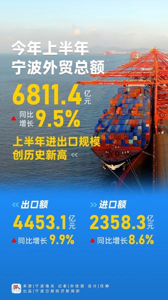 上半年,寧波外貿總額為6811.4億元,比去年同期增長(cháng)9.5%。