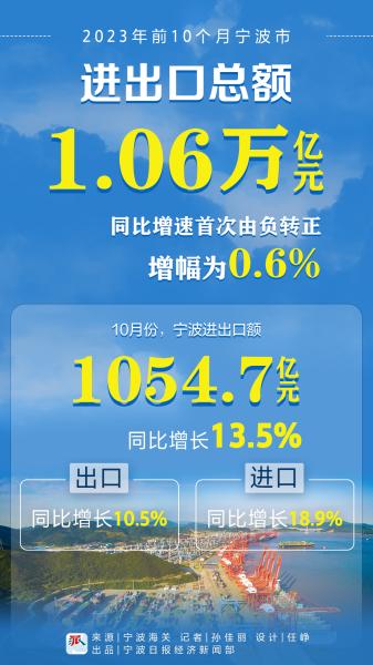 據寧波海關(guān)數據顯示,前10個(gè)月,寧波進(jìn)出口總額達1.06萬(wàn)億元,同比增速今年以來(lái)首次由負轉正,增幅為0.6%。其中,出口額超6900億元,同比增長(cháng)1.5%;進(jìn)口額超3600億元,同比降幅較前9個(gè)月收窄1.9個(gè)百分點(diǎn)。
